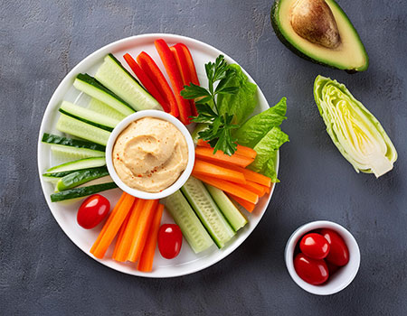 - Arrange the prepared vegetables around the hummus in a visually appealing manner.